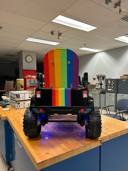 This is Mia. Mia has a variety of disabilities, such as visual impairment and muscle weakness, that prevented her from being able to use commercially available power wheel vehicles. She loves sounds, lights, and stretchy fabric. She uses supramalleolar orthoses (SMOs) to move around, walking around 10-15 steps at a time. Mini-Movers was able to modify a power wheel jeep by moving the pedal into the steering wheel, providing safety supports (supportive backing and additional seat belts), and adding 3D printed accessible switches. We customized the car to suit her personality with bright rainbow colors, stretchy fabric padding, and LED light underglow. Being able to present the modified car to Mia at our end of year interdisciplinary fair was an impactful experience for all volunteers, her family, and attendees. Mia enjoyed trying out the car, fitting perfectly and interacting with the modifications to move the car. Mia’s mom, Suzy, was overjoyed for the opportunity for Mia to move around independently and play. Seeing the enjoyment on Mia’s and her moms face demonstrated the change Mini-Movers was able to create for their family.